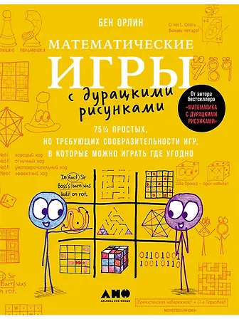 Книжки Орлина - это просто находка для тех, кто хочет понимать что-то о математике, но вам кажется, что она вам не дается. В этот раз автор предлагает нам целую книгу математических и логических игр, в которых нужно считать, думать, анализировать и т.д. Для партии в большинство из них нужен только листок в клеточку и пара карандашей. Здесь можно найти множество интересных вариаций крестиков-ноликов, змеек, судоку и даже "камень-ножницы-бумага-ящерица-Спок". :)