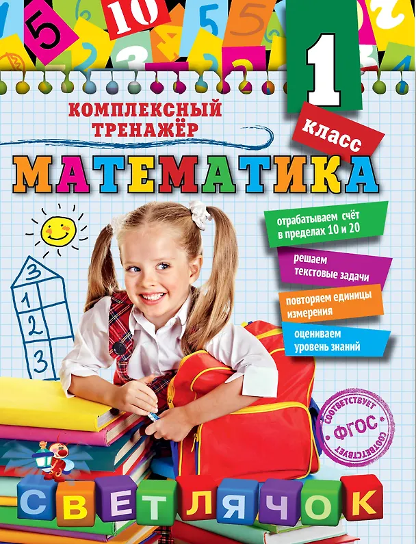 Комплексный тренажер по математике, подготовленный в соответствии с требованиями ФГОС, поможет школьникам довести до автоматизма навыки в решении примеров на сложение и вычитание в пределах 10 и 20, разных видов текстовых задач и заданий на единицы измерения, усвоить основы геометрии, а также оценить свои знания после выполнения проверочной работы, закрашивая звездочку в определенный цвет.
