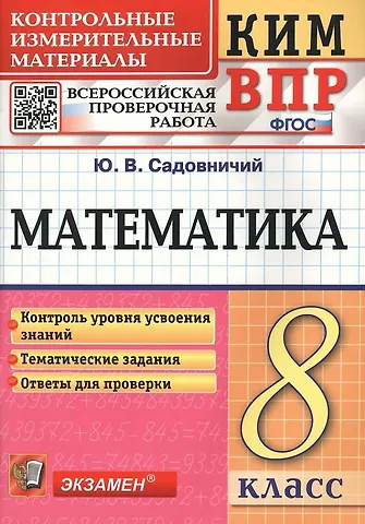 Данное пособие полностью соответствует федеральному государственному образовательному стандарту (второго поколения). В данном пособии представлены контрольные измерительные материалы по математике для учащихся 8-го класса. Тематика предлагаемых тестов охватывает все темы 8-го класса, соответствует программе общеобразовательных организаций по математике и аналогичным материалам ВПР. Назначение пособия - от-работка практических навыков учащихся при подготовке к Всероссийской проверочной работе.