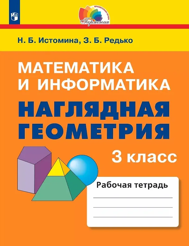 Рабочая тетрадь Математика и информатика Наглядная геометрия 3 класс 2024 год УМК Гармония Авторы Истомина Н.Б., Редько З.Б.Тетрадь «Наглядная геометрия» для 3 класса является продолжением Тетрадей с одноименным названием для 1 и 2 классов. В процессе выполнения заданий, предложенных в данной тетради, у учащихся расширяются и дифференцируются представления о плоских и кривых поверхностях, о многогранниках, о пересечении фигур; о круге как сечении шара, о связи круга и окружности как его границы, о взаимном расположении окружностей и кругов на плоскости. В соответствии с требованиями Федерального государственного образовательного стандарта начального общего образования рекомендуем использоват