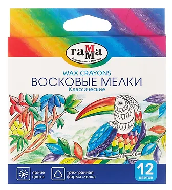 Набор из 12 восковых мелков ГАММА серии «Классическая» отлично подойдёт для рисования на бумаге, картоне и любой шероховатой поверхности. Мелки имеют эргономичную трёхгранную форму, длина мелка составляет 90 мм, а диаметр корпуса — 8 мм. В наборе 12 ярких цветов: жёлтый, зелёный, синий, красный, чёрный, коричневый, оранжевый, розовый, бледно-розовый, фиолетовый, голубой, жёлто-зелёный. Они идеальны для первых начинаний ребенка в рисовании и раскрашивании, так как они удобно лежат в руке. Мелки производятся на основе натуральных растительных компонентов: воска и естественных пищевых красителей. Мелки не пачкают руки, не липнут, не имеют выраженного химического запаха. Каждый мелок обёрнут в бумажную гильзу и уже заточен.