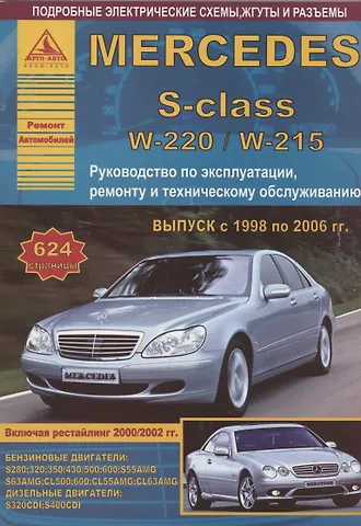Справочное пособие Книга по ремонту Mercedes S-class (W 220 / W 215), а также инструкция по эксплуатации и техническому обслуживанию автомобилей Мерседес С-класса (В 220 / В 215) с 1998 по 2006 гг. Выпуска, учитывая обновления 2000 / 2002 гг. Модели оборудованы бензиновыми двигателями S 280; 320; 350; 430; 500; 600; S 55 A MG; S 63 AMG; CL 500; 600; CL 55 AMG; CL 63 AMG и дизельными двигателями S 320 CDI; S 400 CDI.