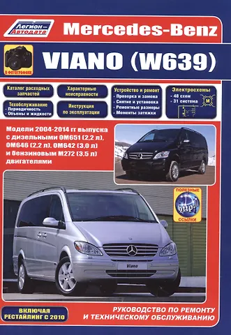 Книга по ремонту Мерседес Виано, профессиональное руководство по ремонту и эксплуатации Mercedes Viano 2004-2014 г. выпуска, оборудованных дизельными двигателями рабочим объемом 2.2 литра (ОМ 651 и ОМ 46), 3.0 литра (ОМ 642) и бензиновыми двигателями рабочим объемом 3.5 литра (М 272)