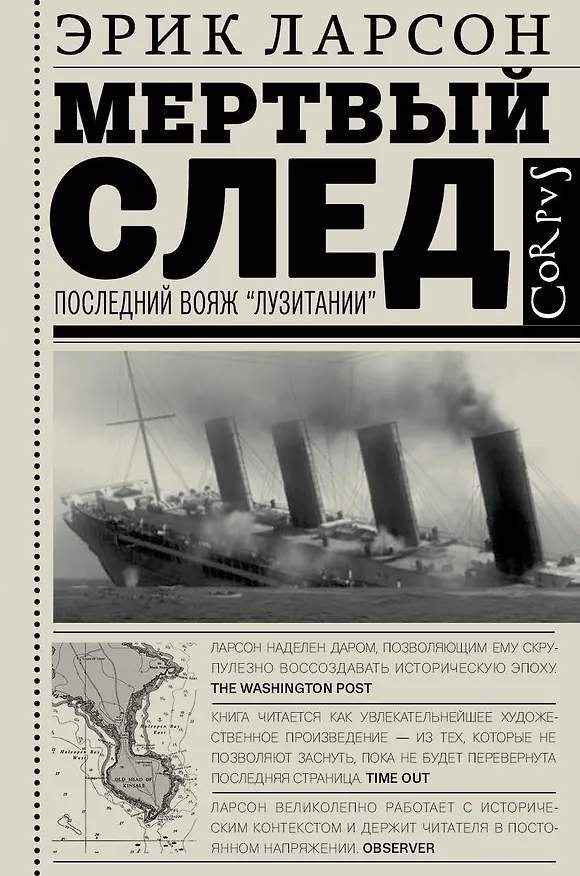 Эрик Ларсон – американский писатель, журналист, лауреат множества премий, автор популярных исторических книг. Среди них мировые бестселлеры: «В саду чудовищ. Любовь и террор в гитлеровском Берлине», «Буря «Исаак»», «Гром небесный» и «Дьявол в белом городе» (премия Эдгара По и номинация на премию «Золотой кинжал» за лучшее произведение нон-фикшн от Ассоциации детективных писателей). «Мертвый след» (2015) – захватывающий рассказ об одном из самых трагических событий Первой мировой войны – гибели «Лузитании», роскошного океанского лайнера, совершавшего в апреле 1915 года свой 201-й рейс из Нью-Йорка в Ливерпуль. Корабль был торпедирован германской субмариной U-20 7 мая 1915 года и затонул за 18