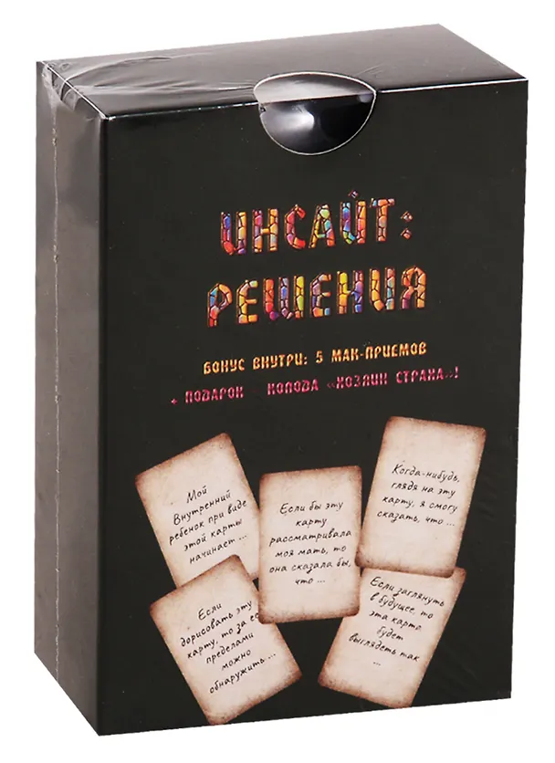 .В ситуациях, когда Вам сложно выбрать методику работы с МАК, колода "Инсайт: Решения" станет Вашей палочкой-выручалочкой! Просто предложите клиенту выбрать несколько карт из колоды – и он сам начнет рассказывать Вам о решении своей проблемы или задачи.