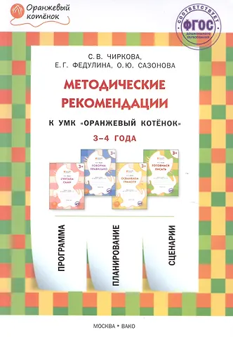 Учебно-методические пособие к рабочим тетрадям «Считаем сами», «Говорим правильно», «Осваиваем грамоту», «Готовимся писать» для занятий с детьми 3—4 лет, составленное в соответствии с требованиями Федерального государственного образовательного стандарта дошкольного образования, является составной частью учебно-методического комплекта «Оранжевый котёнок». Пособие включает в себя программу, планирование и оригинальные сценарии, составленные на основе единого календарно-тематического плана. Предназначается педагогам дошкольных образовательных организаций, учителям начальных классов, гувернерам и родителям, уделяющим особое внимание общему развитию детей и подготовке их к школе.