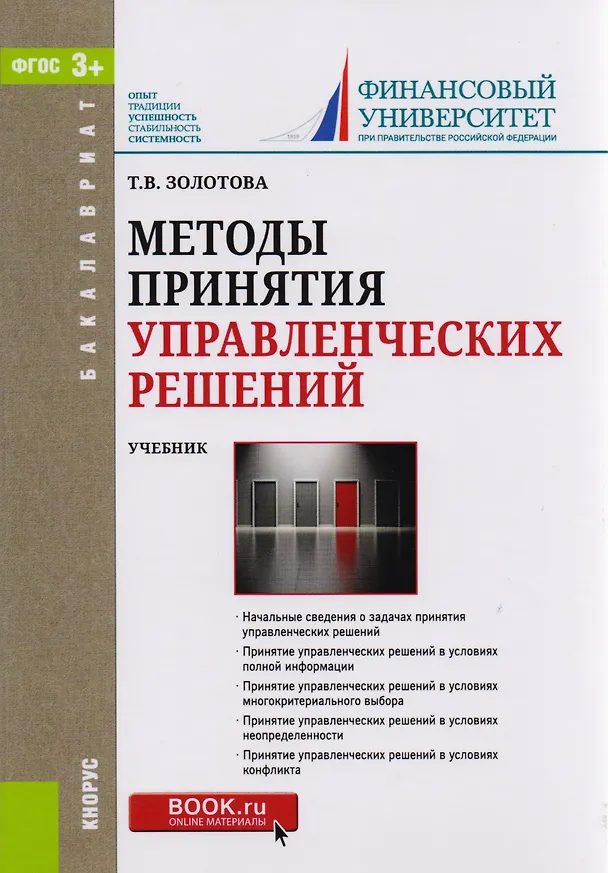 В учебнике изложены основные понятия теории принятия управленческих решений, принципы моделирования проблемной ситуации в системах управления, дана характеристика математических моделей принятия решений и их классификация, приведен математический аппарат теории принятия решений. Рассмотрены различные информационные модели и методы управления для систем, функционирующих в условиях многокритериальности, вероятностной неопределенности или полной неопределенности, в условиях конфликта. Соответствует ФГОС ВО 3+. Учебник предназначен для специалистов, изучающих курс «Методы принятия управ-ленческих решений», бакалавров и магистров, изучающих курс «Теория принятия решений». Учебник может быть полез
