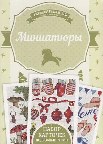 Милые маленькие изображения, детали и предметы для вышивания крестом. Каждая модель сопровождается схемой и ключом, что позволит справиться с узором как опытной, так и начинающей вышивальщице. Различные элементы весенней, летней, осенней и зимней композиций, нежные цветы, птицы, детские игрушки, чашки и круасcаны, коллажи яркой зелени и лесных ягод, детали интерьера и известных городов мира - используйте эти потрясающие Миниатюры как прекрасный модный декор, украшения для постельного белья или кухонных полотенец, в качестве стильной детали на одежде или же как оригинальный подарок. 24 узора представлены на карточках и собраны в папку. Такая подача облегчит работу с каждой схемой, но в то же