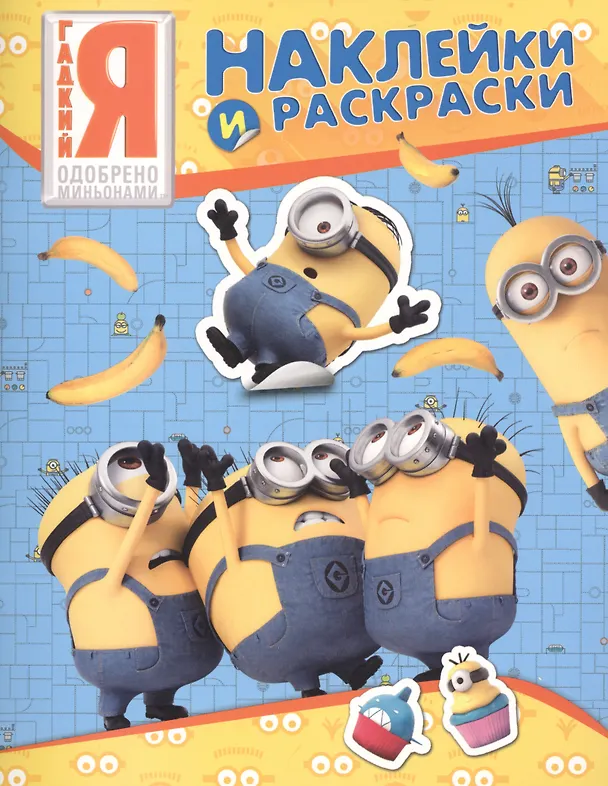 Цветная брошюра с раскрасками и большим листом наклеек. Игры с наклейками и раскраски на каждом развороте. Сюжеты из популярного мультфильма про забавных миньонов.