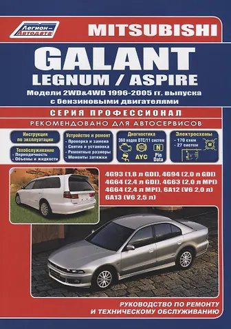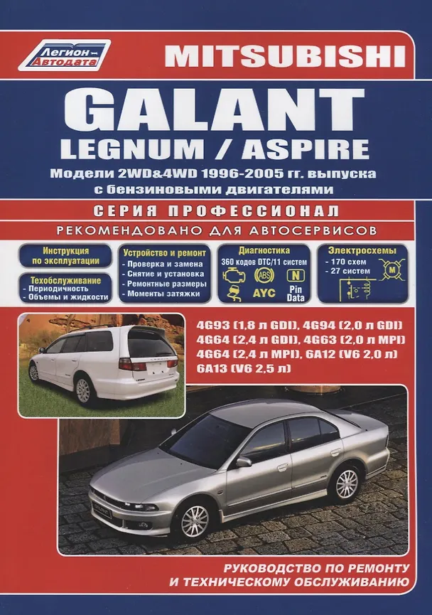 Иллюстрированный справочно-информационный мануал Руководство по ремонту Mitsubishi Galant / Legnum / Aspire, а также руководство по техническому обслуживанию и эксплуатации, устройство автомобилей Mitsubishi Galant / Legnum / Aspire 1996-2003 гг. выпуска с левосторонним и правосторонним рулевым управлением, оборудованных бензиновыми двигателями GDI 4G93 (1,8 л), 4G94 (2,0 л), 4G64 (2,4 л) и бензиновыми двигателями MPI 4G63 (2,0 л), 4G64 (2,4 л), 6А12 (V6 2,0 л) и 6А13 (V6 2,5 л)