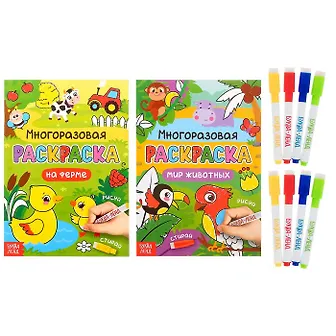 Многоразовая раскраска. Мир животных (с маркерами) (комплект из 2 книг)