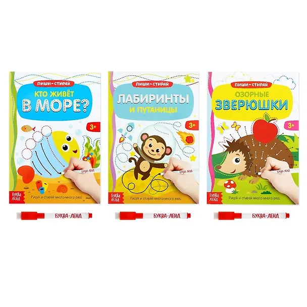 Набор из трёх тетрадей, к ним три маркера, тетради многоразовые, маркер легко стирается, на нем есть ластик, но правда, он быстро пачкается, но можно стирать чем угодно. Сыну очень понравилось в 3 года, ведь маркером писать очень просто, особо нажимать не надо, это неплохое начало подготовки руки к письму. Яркая тетрадь и задания полезные