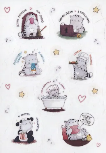 Наклейки с котиками сами по себе очень милые. Каждый котик особенный, хорошо прорисован и раскрашен. Покупала эти наклейки для подруги, которая любит котов и все милое. Понравился стиль рисунка и цветовая гамма. Коты настолько милашные, что их жалко куда-то клеить и поэтому купили дубль.