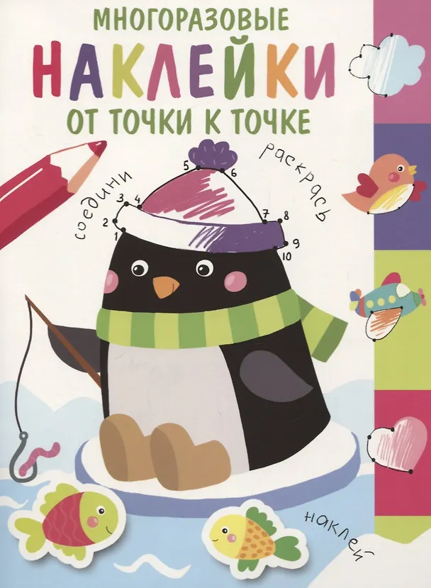 Соединяй точки по порядку, рисуй и раскрашивай. Дополняй картинки наклейками. Наклейки в этой книжке многоразовые, поэтому их можно приклеивать снова и снова!