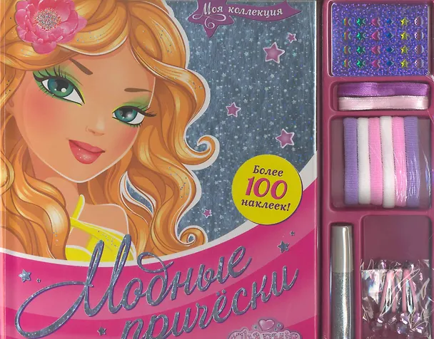 .Картонная книга в твердом переплете, обложка с фольгированием. Голографические и объемные наклейки, блестки, заколки и резинки для волос, ленточки.