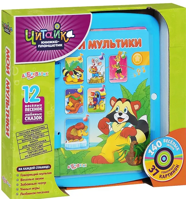 Новинка! Уникальный говорящий планшетик «Читайка»! Самые известные мультфильмы, увлекательные игры и забавные звуки - всё это в одной книжке-игрушке! Листай странички, нажимай на картинки и играй с любимыми мультяшками: Мамонтёнком, попугаем Кешей Крошкой Енотом и др. Бонус - музыкальный плеер с весёлыми песенками!