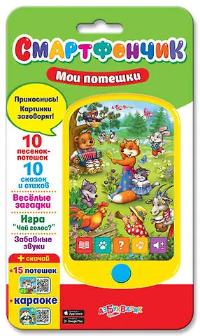 10 песенок-потешек, 10 сказок и стихов, весёлые загадки, игра «Чей голос?», забавные звуки и голоса – всё это ты найдешь в смартфончике «Мои потешки»! С такой игрушкой – не соскучишься!