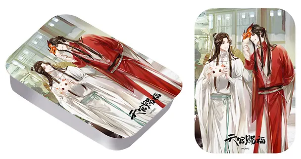 Отдельно хочу отметить упаковку-жестяная баночка, крышка сдвигается в бок, и на крышке изображены мои любимые герои Се Лянь и Хуа Чен.