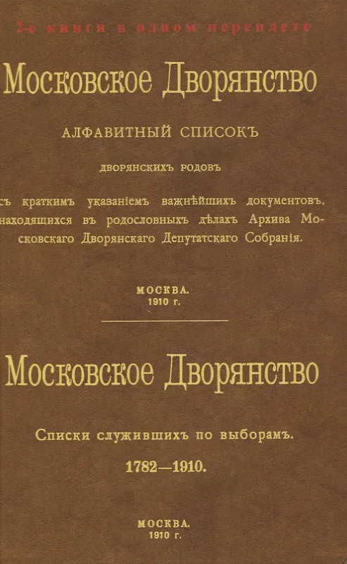 Репринт с изданий Москва, 1910. Две книги, изданные в 1910 г. Алфавитный список дворянских родов. - В продажу издание не поступало. Тираж был 38 экз. Одна из самых редких книг по истории Московского Дворянства.( Алфавитный список дворянских родов с кратким указанием важнейших документов, находящихся в родословных делах Архива Московского Дворянского Депутатского Собрания). Издание представляет собой перечень фамилий, которым было пожаловано дворянство и чьи дела (копии указов о присвоении, ходатайства, грамоты и т.п.) находятся в Центральном историческом архиве г. Москвы. Редкий справочник, посвященный Московскому дворянству. + Списки служивших по выборам 1782-1910. В издание вошли списки ли