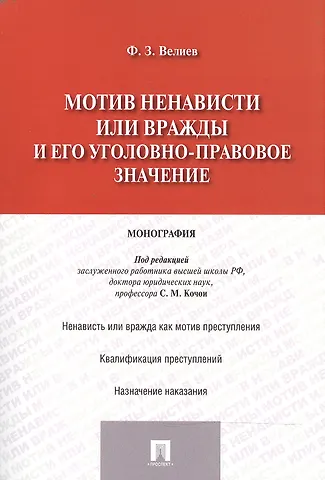 В этой работе мотив ненависти или вражды является самостоятельным объектом изучения. Она содержит анализ существующих точек зрения о понятии мотива ненависти или вражды. В работе особое внимание уделено проблемам квалификации преступлений, совершаемых по указанному мотиву, в судебно- следственной практике и назначения наказания за них в судебной практике. Законодательство приведено по состоянию на май 2015 г.