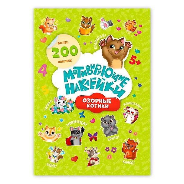 Яркие наклейки с изображением озорных котиков с поощрительными надписями помогут учителям, воспитателям детских садов и развивающих центров отметить старания ребят за правильно решенную задачу или аккуратно выполненное упражнение. Дополнительно прилагаются маленькие поощрительные наклейки в виде сердечек, оценок, звездочек и аплодисментов.