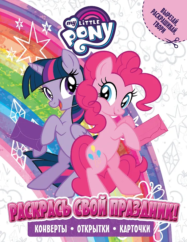 Сумеречная Искорка и Пинки Пай придумали новое развлечение, в котором тебе точно захочется поучаствовать! Перед тобой целая книга для создания приглашений, карточек, конвертов, открыток — с твоими любимыми персонажами! Дело за малым: организовать вечеринку в стиле пони и собрать друзей.