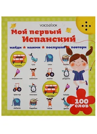 Интерактивная голосовая книга для изучения испанского языка «Мой Первый Испанский». Первые 100 испанских слов малыш сможет выучить сам, находя одинаковые изображения автобуса, слона или барабана. Одно из изображений озвучено на русском языке, другое - на испанском. Нажимая на рисунок и повторяя услышанное, ребенок понимает, что один и тот же предмет звучит по-разному и запоминает, как его произносить.