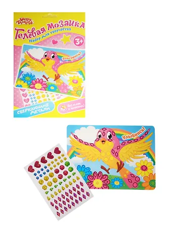 .На основе расположена разноцветная картинка, изображающая жизнерадостных персонажей. Расположите на ней гелевые стразы разной формы в соответствии с контуром-подсказкой. Творить могут даже самые маленькие: клей и ножницы не понадобятся.