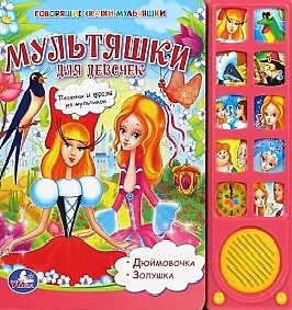Замечательная книга «Мультяшки для девочек» просто очарует вашу малышку своими красочными картинками и увлекательными сказками «Золушка» и «Дюймовочка». Иллюстрации точно такие же, как и в одноименных мультфильмах. Страницы изготовлены из плотного картона, так что переворачивать их удобно даже маленьким ручкам. Книга надолго сохранит свой безупречный вид! А еще у книжки есть 10 звуковых кнопок, нажав на которые можно услышать фразы или, если кнопки помечена нотками, песенки из мультфильмов. В книге отмечены места, к которым относятся звуковые кнопки. Такую книжку хочется перечитывать снова и снова. С такой книгой у вашей малышки будут развиваться усидчивость, память, слуховое и зрительное во
