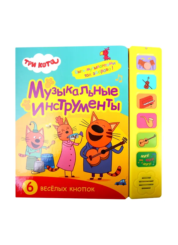 Книга «Музыкальные инструменты» с 6 звуковыми кнопками серии «Три кота. Звуковые книжки» — это веселая история о приключениях Коржика, Карамельки и Компота, которая познакомит ребенка с музыкальными инструментами. Герои мультфильма хотят организовать свою музыкальную группу и выбирают подходящие инструменты. Историю сопровождает 6 музыкальных фрагментов: пять из которых — звуки барабанов, скрипки, пианино, саксофона, гитары, а шестой — получившаяся песня трех котов. При повторном нажатии на кнопки звук можно выключать. Также на страницах книги ребенка ждут занимательные задания на развитие логики, внимания и обучение счету.