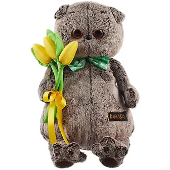 Кот Басик – настоящий джентльмен! Он приготовил для вас подарок – жёлтые тюльпаны – и надел зелёный бант в горошек. Как не влюбиться в такого красавца? Басик будет отличным подарком для ребёнка на Новый год или день рождения. Он очень мягкий и приятный на ощупь – так и хочется взять его на ручки и обнять. С такой игрушкой ребёнок будет весело играть днём и спокойно засыпать ночью.
