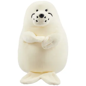 Очень мягкий и приятного беловатого цвета, также отлично прошиты швы и нигде нитки не торчат. Некоторые детали прошиты, некоторые наклеены(глазки и носик), однако клея не видно,все аккуратно! При стирки меньше не становится, ничего не рвется, так что несмотря на белый цвет можно постирать, и не беспокоиться, что игрушка потеряет цвет или испортится!