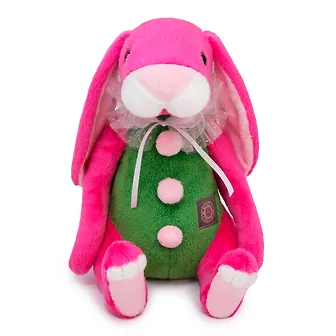 Ошеломительная розовая крольчиха Матильда сшита из мягкого софта нескольких цветов. Спереди три нежно‑розовых помпона, а на шейке воротник‑жабо из бледно‑розовой сеточки с серебристым блеском на атласной ленте.