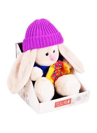 Хорошая и качественная игрушка отечественного производства. Зайчик милейший, мордочка у него очаровательная: глазки-бусинки, есть бровки, носик розовый. Весь зайчик такой мягонький, плюш приятный на ощупь, набит наполнителем плотно. Ножки меняют положение, можно его посадить, а можно положить, ножки полые внутри, а ступни набиты. У зайки красивый наряд, вся одежда снимается, шапочка и свитер вязанные, на груди большая блестящая брошь на жёлтом шёлковом бантике, штанишки сшиты из бархатной ткани салатового цвета. Все элементы одежды насыщенных и ярких цветов, смотрится очень красиво, а брошь - это дополнительное украшение данной игрушки. К приобретению рекомендую, игрушка замечательная по качеству исполнения и внешнему виду.