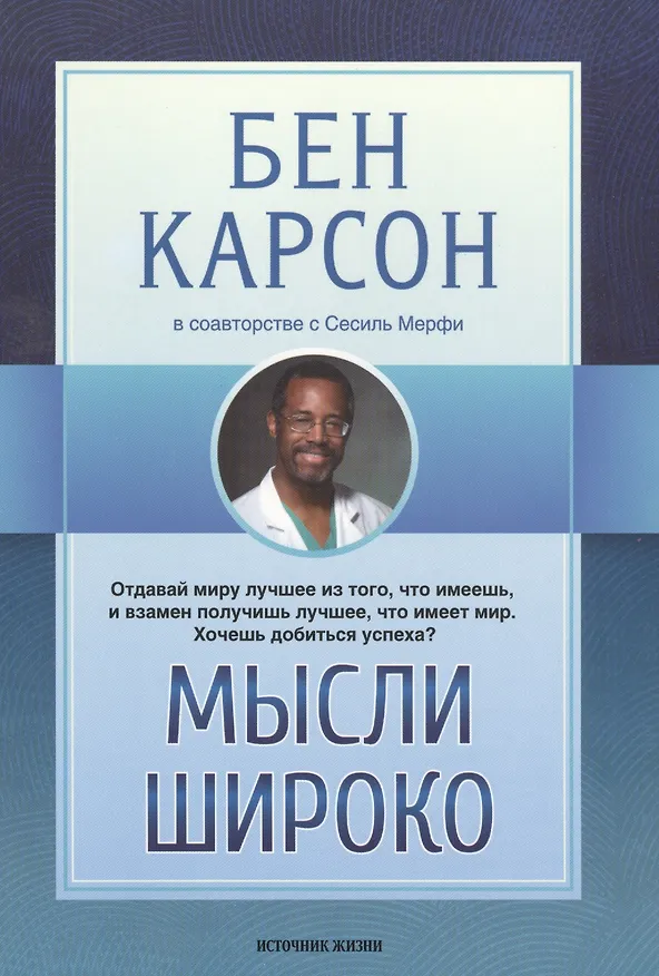 Прочитать эту книгу мне посоветовала моя лучшая подруга. Я купила, прочитала и была удивлена как простой мальчик из неблагополучной семьи, совершенно «без связей» смог не только получить отличное образование, но и стать знаменитым и высококлассным специалистом- нейрохирургом. Да, книга действительно вдохновляет: поставь цель в жизни, продвигайся к ней постоянно, упорно и будешь иметь успех. Для тех, кто прочитал первую книгу Бена Карсона « Золотые руки», хочу сказать, что она охватывает всю его жизнь, а «Мысли широко» раскрывает принципы его мышления и жизни. Он говорит о важности знания в жизни молодых людей, о том, какими чертами характера должен обладать успешный человек и как ко всему этому придти. Изменения жизни возможны и они в руках самого человека.