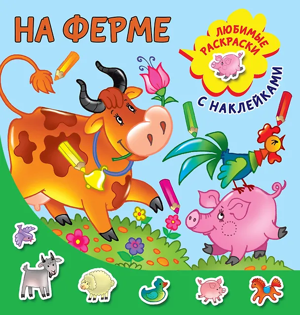 Раскраска с наклейками «На ферме» обязательно понравится дошколятам, ведь она придумана специально для маленьких художников. Малыш запомнит названия домашних животных. Наклейка-образец подскажет крохе, в какие цвета раскрасить каждый рисунок. На плотной бумаге можно творить карандашами и пальчиковыми красками, мелками и даже фломастерами.