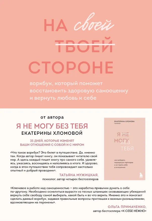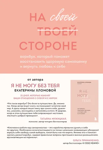 В основе воркбука «На своей стороне» — авторский метод психолога Екатерины Хломовой по восстановлению самооценки, который дополняет ее книгу-бестселлер «Я не могу без тебя».