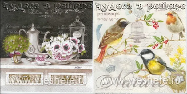 Салфетки для декупажа, подходят для декорирования любых поверхностей - дерево, стекло, пластик и т.д. Мастера часто используют их для декупажа ваз, бутылок, подносов, мебели и многого другого.