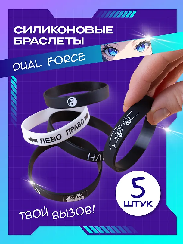 Набор силиконовых браслетов «Dual Force» воплощает баланс стиля и смысла. Название переводится как «двойная сила». Оно отражает дуальность дизайна, ведь в комплекте присутствуют аксессуары белого и чёрного цветов. А ещё изделия одновременно сочетают простоту, скрытый символизм.