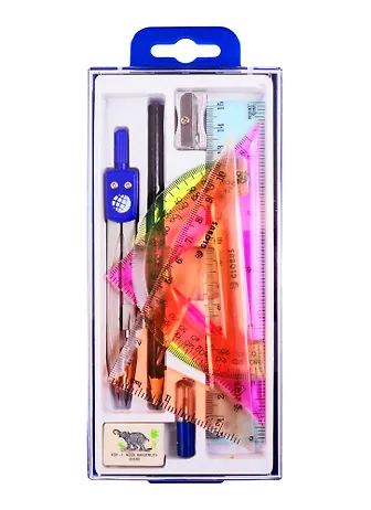 Набор большой, входит множество линеек, транспортир, треугольник, циркуль, ластик и карандаш. Все очень хорошего качества, пользоваться удобно.