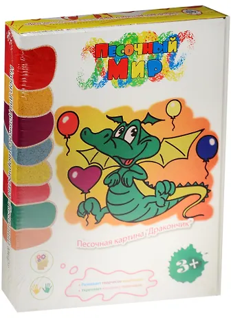 Набор д/дет. творч. Песочная картина Дракончик (104) (в наб.: 3-слойн.карт.осн.с вырез.лазером траф., ., набор цв.песка - 9 цв.в пласт.баночках по 60 гр.) (3+) (Песочный мир) (коробка)