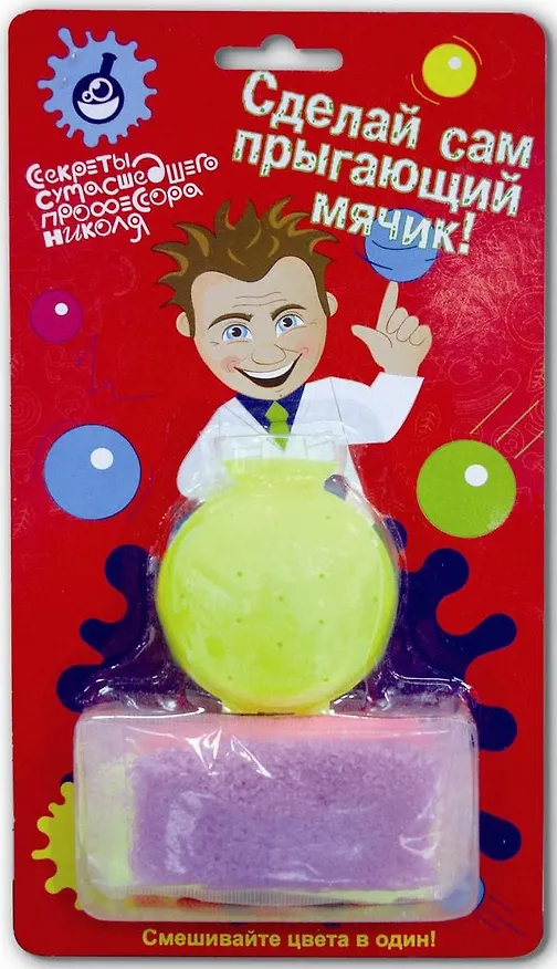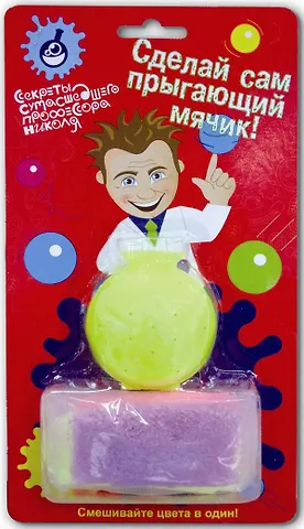 .В наборе есть порошки, форма, порошки нужно высыпать в форму, затем опустить форму с порошками в воду на одну минуту, после этого три минуты продержать форму на воздухе, и мячик готов, его можно вынимать из формы. Чтобы мячик все время оставался способным прыгать, рекомендуется держать его в закрытом контейнере.