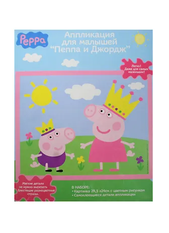 В наборе для объемной аппликации «Пеппа и Джордж» ТМ «Peppa Pig»: цветная картинка размером 29,5х24 см с рисунком, самоклеящиеся детали из мягкого материала ЭВА, которые не нужно вырезать, стразы. Товар сертифицирован. Упаковка – пакет с цветным вкладышем.
