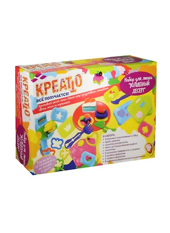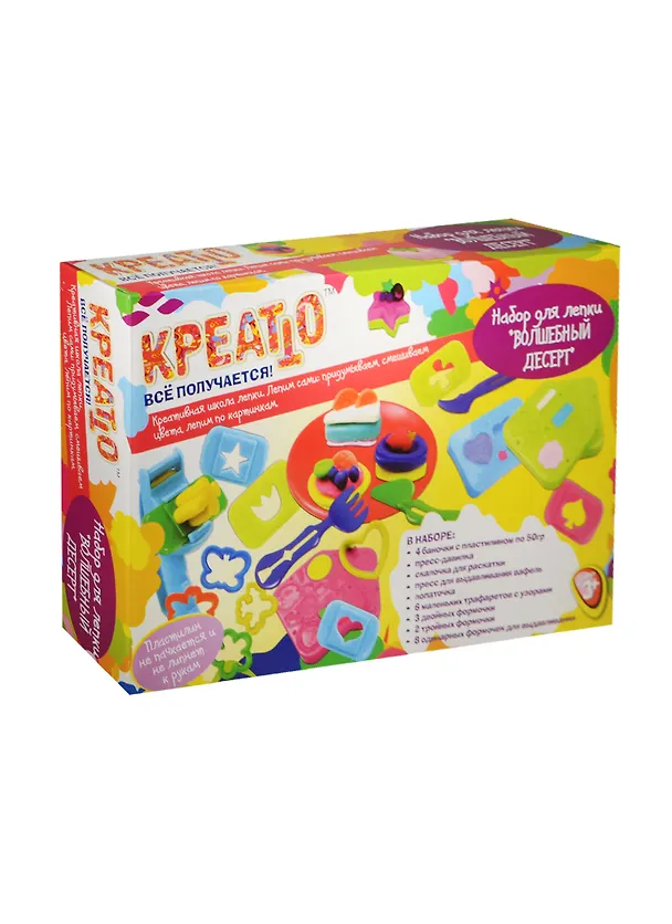 Описание: Окунитесь в настоящее кулинарное творчество вместе с набором для лепки Волшебный десерт! Лепите вафли и пирожные с помощью вафельницы и формочек. Раскатываем пластилин скалочкой, делаем слоеные фигурные печенья в форме звездочек, сердечек, цветочков. С помощью больших формочек и пресс-давилки легко мастерим украшения десерта на свой вкус. По инструкции лепим цыплёнка, ягоды и фрукты. Смешиваем цвета, выбираем разные формы, фантазируем, учимся лепить, развиваем мелкую моторику. С Креатто все задуманное получается! В наборе: застывающий пластилин 4х50 гр, пресс-давилка, 3 трафарета с узорами, пресс для выдавливания вафель, 2 двойные формочки, 3 объемные формочки, 4 формочки для вырез