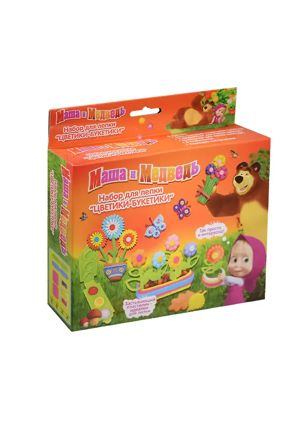 Добро пожаловать в цветочный сад Маши и Медведя! Создавайте из пластилина прекрасный цветник с помощью объемных формочек. Вложите в них пластилин, плотно сожмите половинки и раскройте – у вас получатся милые цветочки и вазочки. Теперь соедините их с помощью стебельков. Создавайте букеты, клумбы, лепите свои собственные фигурки – бабочек, грибочки, листочки и многое другое. Смешивайте цвета, получайте новые оттенки и эффект мрамора. А инструкция в картинках, полезные советы и любопытные идеи, размещенные на упаковке, помогут вам создать самый красивый цветник. С любимыми героями все получается! В наборе для лепки «Цветики-букетики» ТМ «Маша и Медведь» 14 предметов: застывающий пластилин – 3 ц