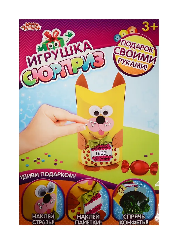 Чтобы создать такую оригинальную игрушку, достаточно следовать инструкции из набора. Вам не понадобятся клей и ножницы. Все элементы уже подобраны для вашего талантливого малыша, который будет с удовольствием собирать этот необычный вид аппликации! Сложите элементы из плотного картона и основу, наклейте дополнительные элементы и украсьте коробочку декором. В готовый шедевр мы предлагаем спрятать сладости, приятные мелочи, пожелания и подарить близким. Такая игрушка-сюрприз удивит любого!