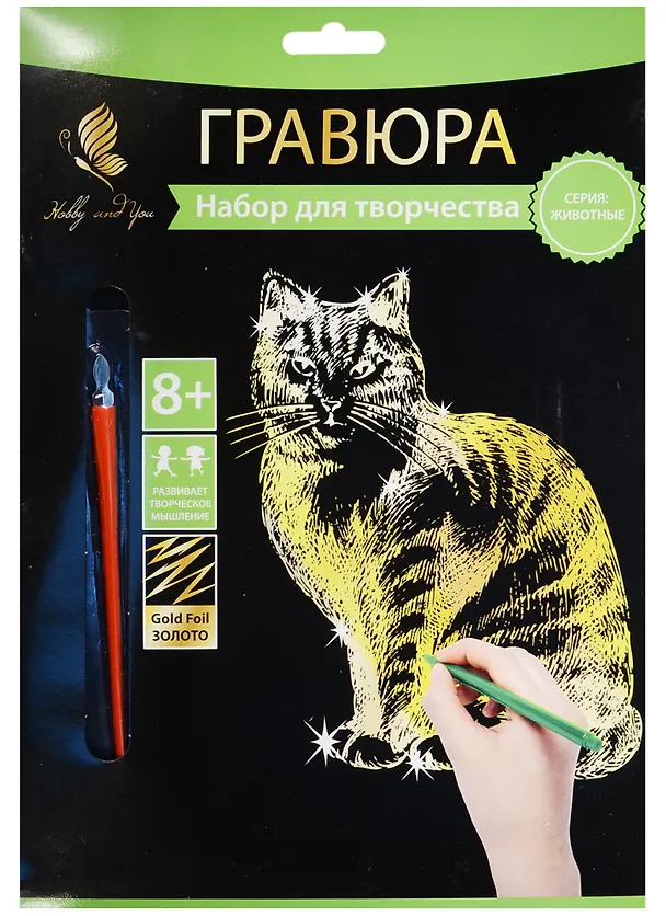 Гравировка - древнее, очень сложное искусство. Наборы «Hobby and you» предлагают познакомиться с гравюрой и выполнить самый интересный этап. С помощью набора «Hobby and you» Ваш ребенок сможет самостоятельно создать настоящее произведение искусства. Техника уникальна, но очень проста: в наборе вы найдете основу с нанесенным контуром и специальный штихель. Благодаря такой технике ребенок сможет создавать сюжеты, достойные великих мастеров, развивая свое художественное мышление. Великолепная гравюра станет прекрасным украшением интерьера и замечательным подарком на любой праздник.