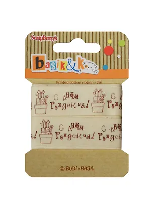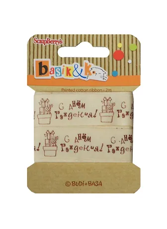 Ленточка принтовая хлопковая Басик, С Днем Рождения, арт.SCB390419, предназначена для хобби, рукоделия, творчества. Используется в скрапбукинге и кардмейкинге для создания декоративных акцентов. Можно применять и в других видах рукоделия (например, шитье, изготовление кукол и т.п.). Длина ленты составляет 2 м. Ширина - 20 мм. Цвет ленты: кремовый. Лента декорирована принтом (подарки, надпись "С Днем Рождения!").