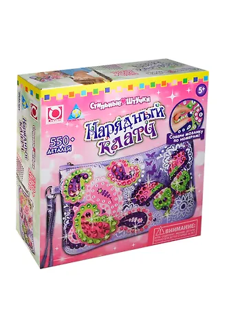 Набор для создания сумочки "Стильные штучки: Нарядный клатч" включает сумочку, 550 разноцветных сверкающих самоклеющихся страз и иллюстрированную инструкцию. Клатч изготовлен из блестящего сиреневого материала.