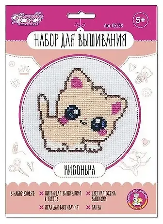 Я сама вышиваю и очень хотела приобщить к рукоделию дочь. Ей пять лет. Для первой 'пробы пера' выбор пал на набор Кисонька. На мой взгляд, он идеален для новичков и детей особенно. Канва крупная, что очень удобно, игла пластиковая, значит, можно не опасаться уколоться, а сама картинка милая и несложная - и вышивается довольно быстро. Дочь справилась почти без моей помощи и очень гордится результатом. Спасибо!